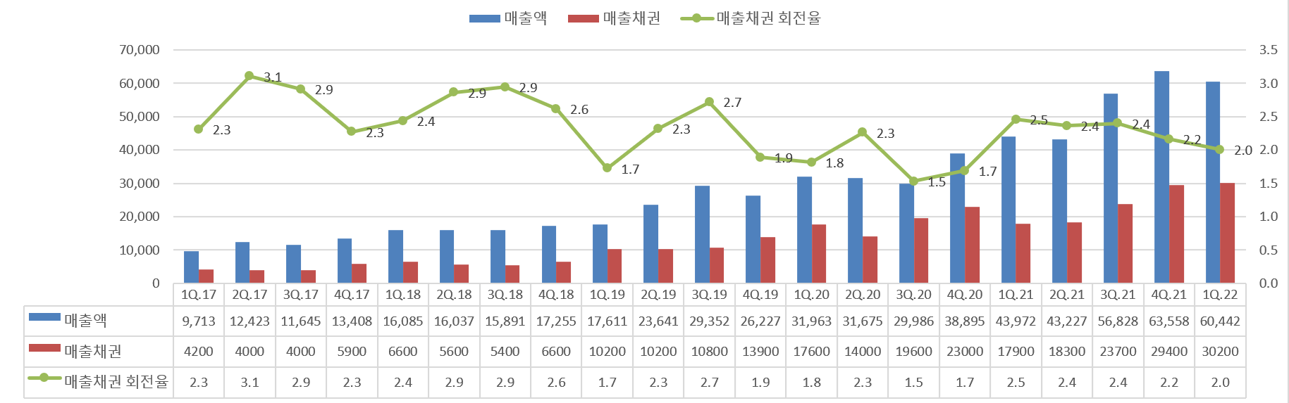 고정비 유형의 기업으로 , 재고자산은 없으며 매출채권과 회전율은 아래 표와 같이 양호하게 관리 잘 되고 있는것으로 보인다.