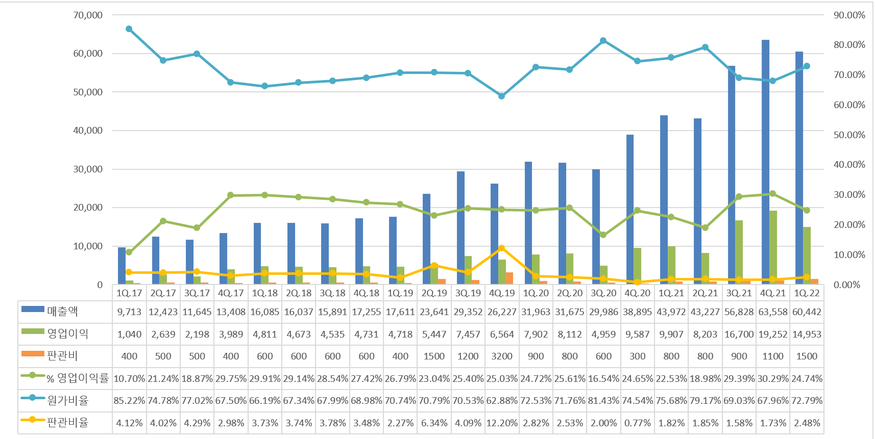 매출액은 전분기 대비 5% 정도 떨어진 모습을 보여주며, 영업이익률 또한 약 5% 정도 떨어진 25% 를 보여준다.