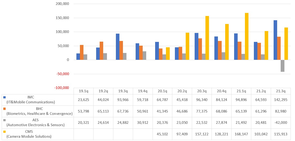 IMC 부분이 20.3Q부터 꾸준히 매출이 늘어나고 있는데, 이는 스마크폰 고사양화로 스마트폰 PBA모듈과 지문인식센서 의 납품 갯수가 늘어나기 때문이다. 특히 폴더블폰 의 본격적인 시장 확대로 인해 탑재되는 지문인식센서모듈에 대한 수요도 증가하고 고가핸펀일수록 ASP 또한 증가할 거라고 보인다.