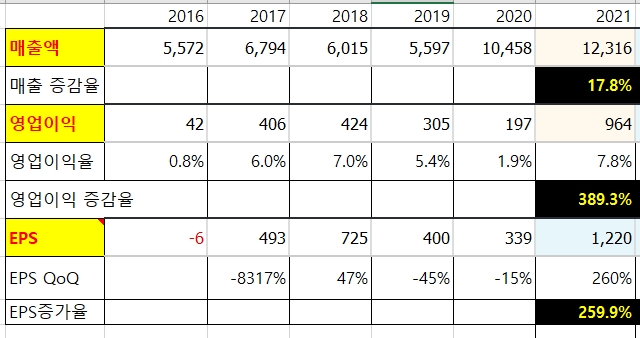 YoY 로 보면 20년 OPM이 1.88% -> 21년 OPM 7.8%로 고가 제품들의 판매가 이루어 지면서 이익률 개선세는