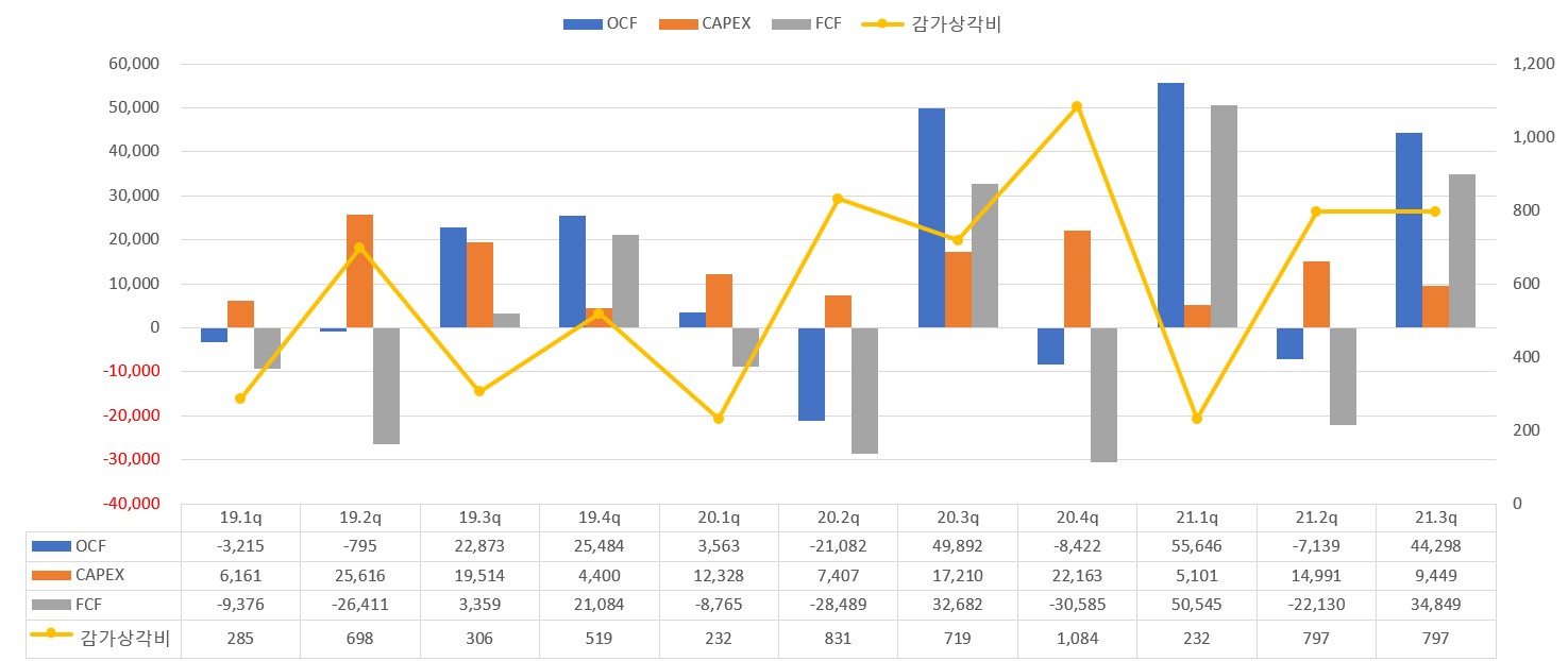 영업활동현금흐름은 양전을 반복하는 모습이지만, 20년 3분기부터 양전환 OCF가 크게 나오는 분기의 빈도수가