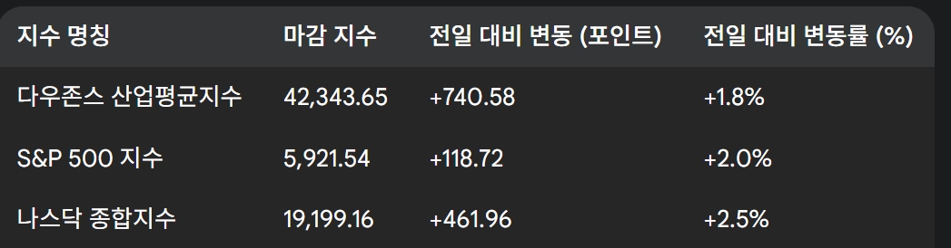 - 유럽연합 EU 상품에 대한 관세 부과 연기 결정과 예상치를 상회한 미국 소비자 신뢰 지표에 힘입어 주요 지수 모두 상승.