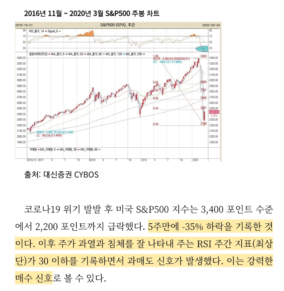 위 차트 주봉에서 볼 수 있듯이, RSI 주간 지표가 30 이하를 기록하면서 과매도 신호가 발생 했을때 강력한 매수 신호로 볼수 있다.