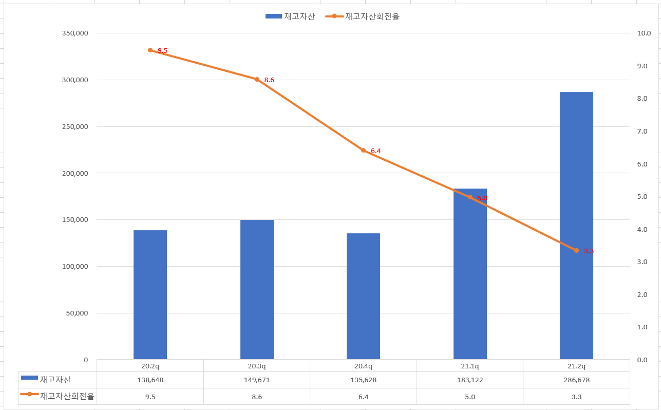 재고자산은 21.1Q부터 급격히 늘어나고 있으며 재고자산 회전율은 떨어지는 모습인데.