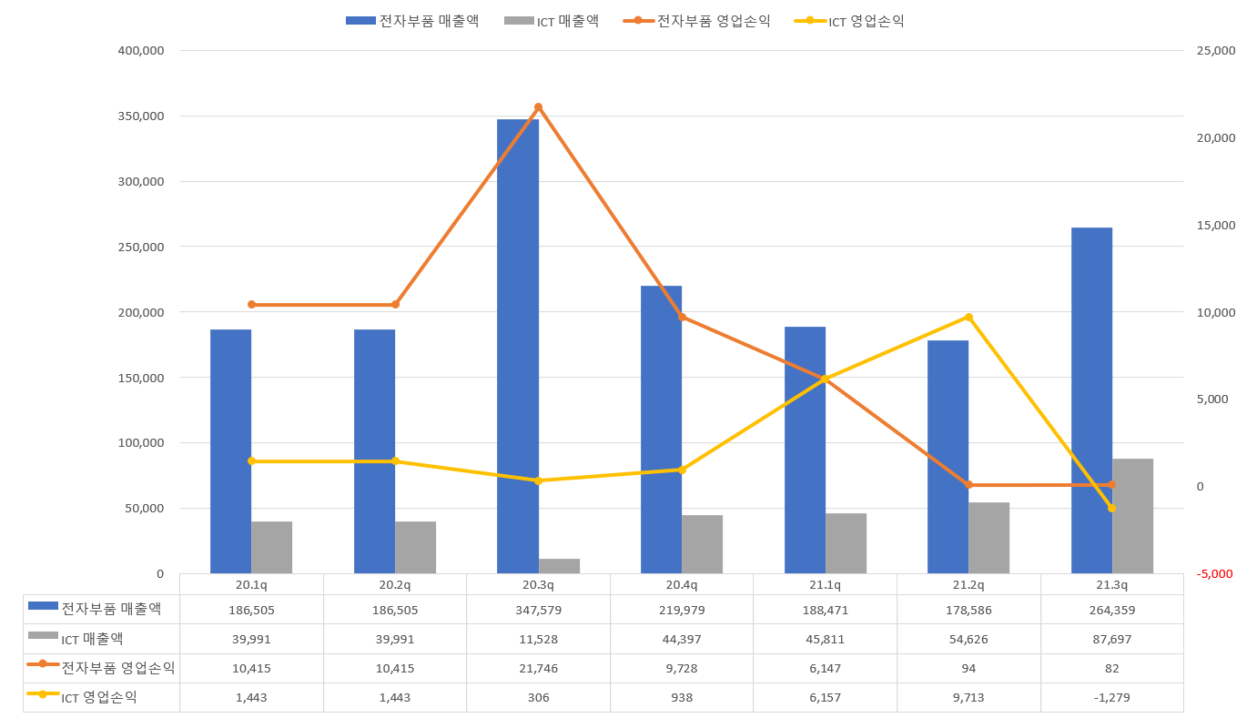 2. 영업이익률 좋은 ESL의 지속적인 매출비중 확대 : 21.1Q기준 전자제품 영익 3~4% / ICT(ESL) 영익 13%