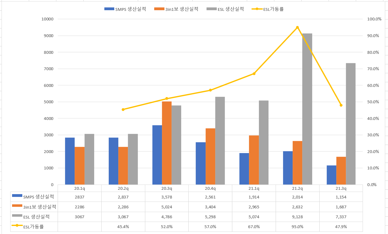 주황색의 3in1은 지속 줄어드는 모습을 보이지만, 향후 먹거리인 ESL의 생산실적을 21년 2Q부터 큰 폭으로 상승하는걸 볼수 있다.