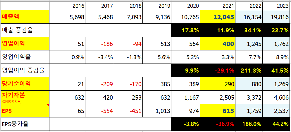2021년 컨센서스(노랑색) 수치는 3분기까지의 실적과 합계와, 21.4Q 컨센에서 40% 정도 차감을 하였다.
