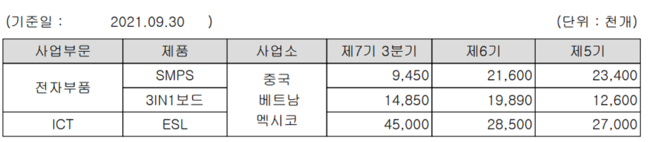 1. 주요 생산 부품 : TV용 파워모듈/3in1 보드, 모바일용 아답터(전자부품사업부문)
