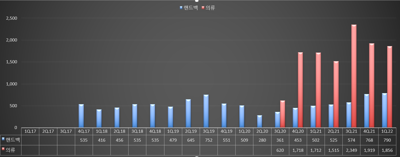 아래 사진 3개를 통해 볼 수 있는것은, 핸드백 매출은 지속적 성장을 하고 있다. 아주 좋은 현상. 왜냐면 핸드백이 더 고마진의 제품이기때문이다.