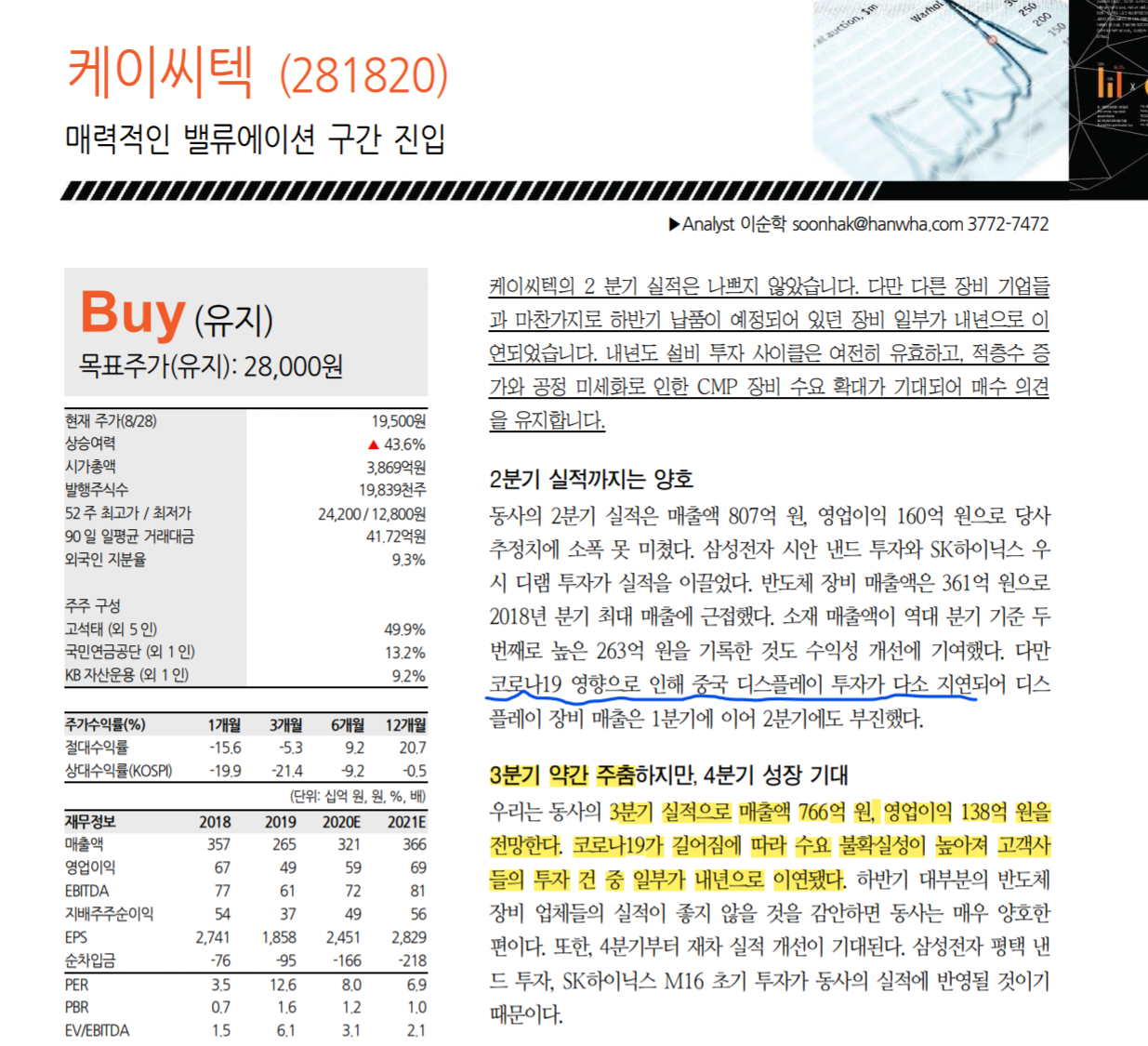 케이씨텍 - 한화증권 리포트 3분기 ▼