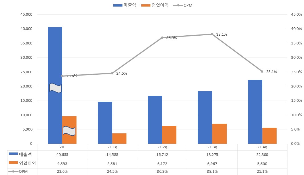 그래도 장기적으로 년 Total로 보면, 확실히 매출액의 급성장과, YoY 영업이익 또한 6% 이상 신장하여 OPM 30% 대를 형성하는 것을 볼 수 있다.