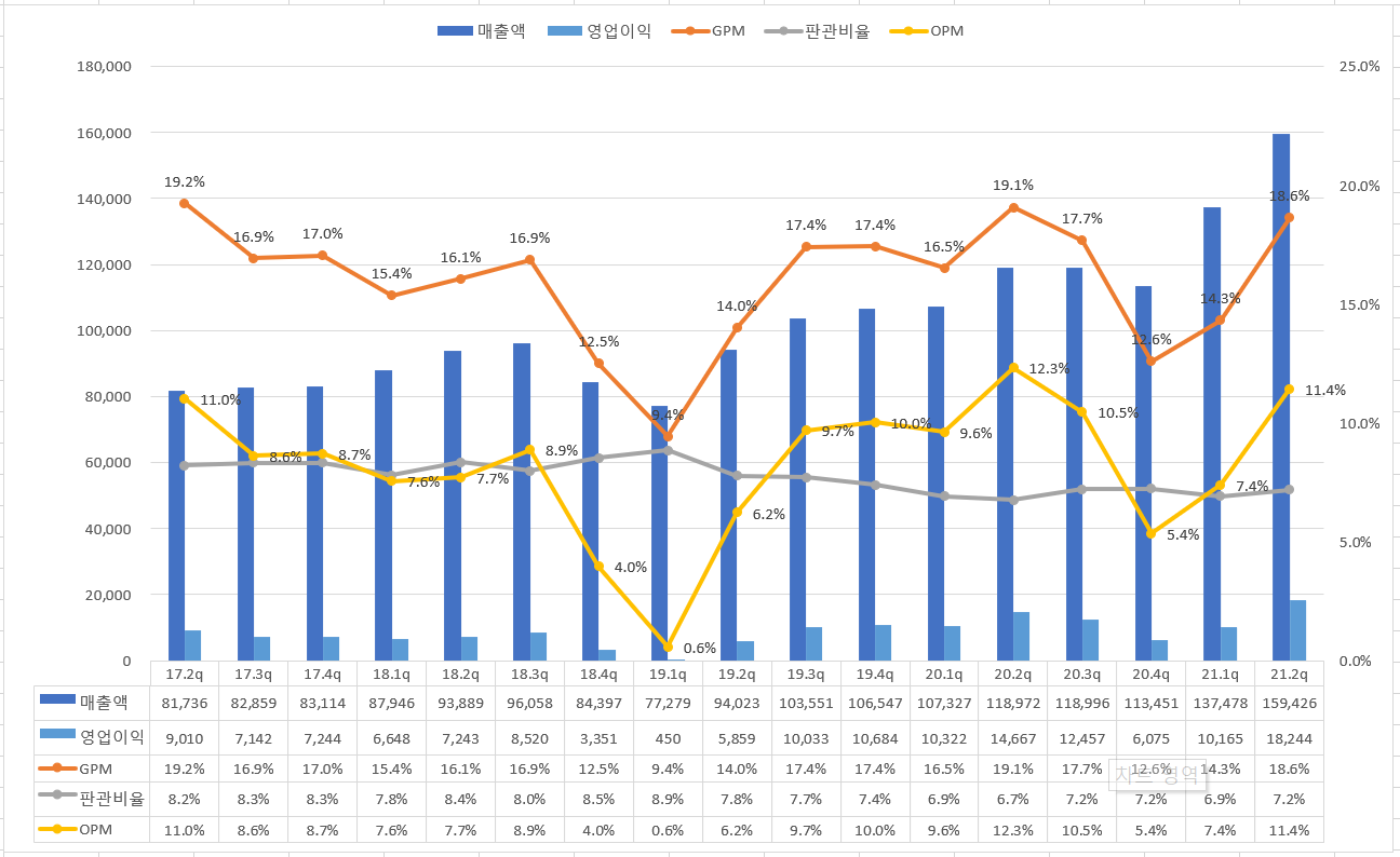 21.2Q에는 가장 이익률이 좋았던 20.2Q의 실적에 가까운 이익률을 보여주고 있다.