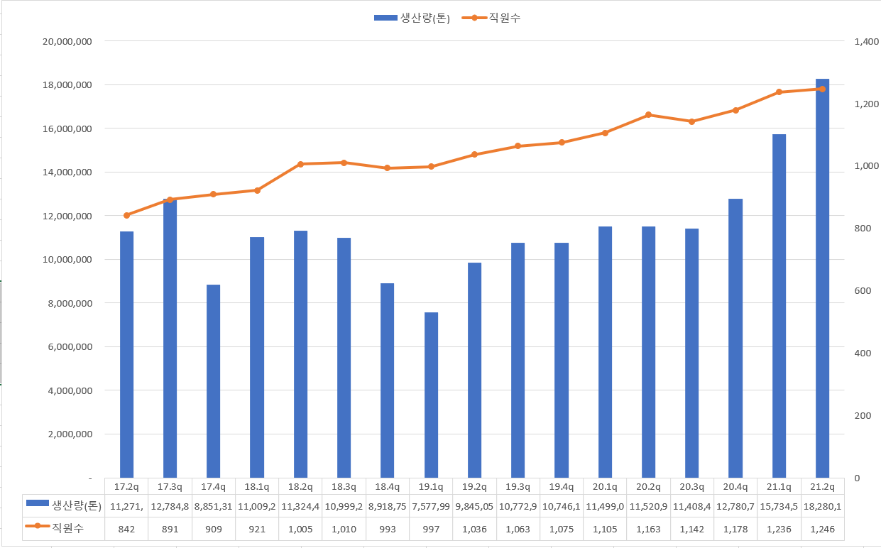 생산량과 비례하게 꾸준히 매분기 직원수 가 늘어 나고 있음을 볼 수 있으며 이런점이 해성디에스 주가 전망에도 밝은 긍정의 빛이 비추어 지는 것 같다고 할 수 있겠네요.