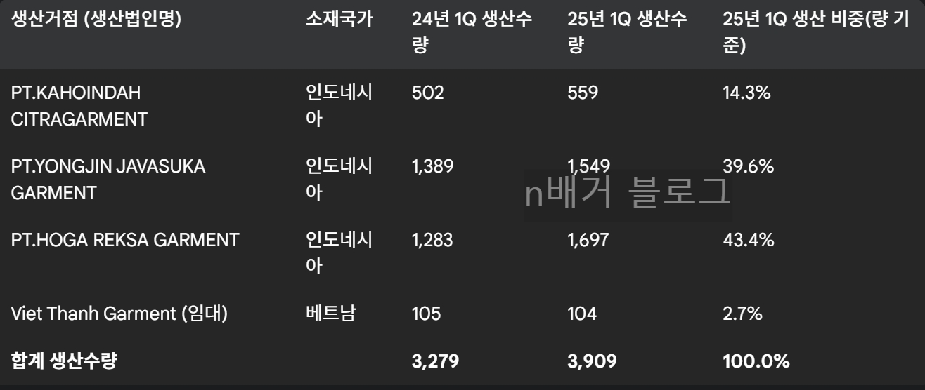 인도네시아는 협상을 진행중에 있으며, 인부 뉴스에서는 인도네시아 경제조정장관이 미국의 관세 정책이 의류 및 신발과 같은 섬유 제품에는 적용되지 않을 수 있다고 언급했다는 내용도 있기는 하지만 아직 관세 리스크의 직격탄을 맞을 수도 있는 기업군에 속하긴 한다. 북미의 매출이 61% 이기 때문.